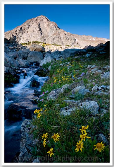 Mount Washakie with stream and flowers, Wind River Range, WY