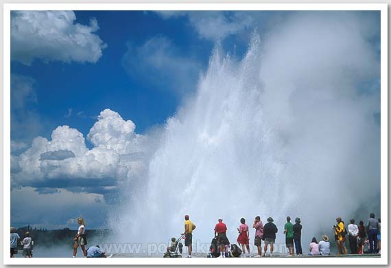 Geyser erupting and crowd, Lower Geyser Basin, Yellowstone National Park, WY