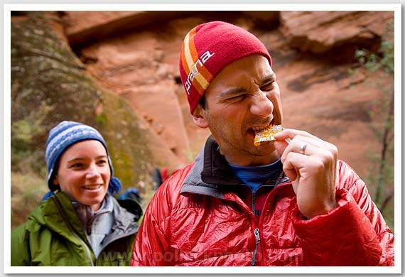 Steve Matera getting desperate for food as Jane Matera watches, Buckskin Gulch, Paria Canyon-Vermilion Cliffs Wilderness, UT