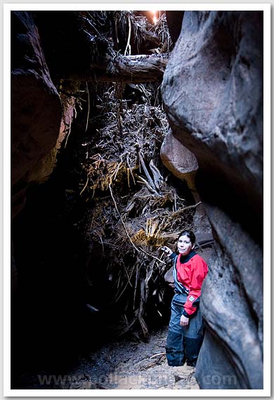 Anna Alonzo at a debris jam, Buckskin Gulch, Paria Canyon-Vermilion Cliffs Wilderness, UT