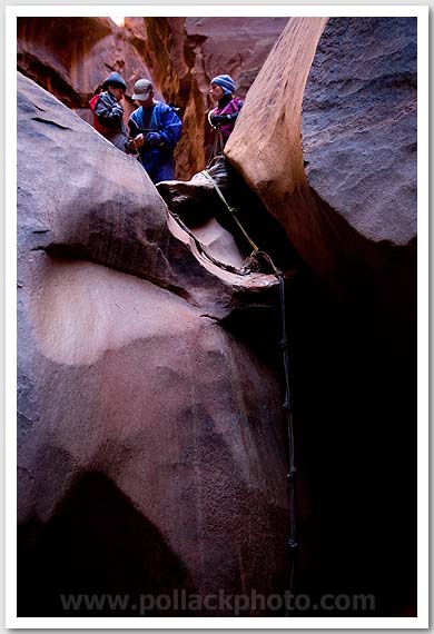 Anna Alonzo, Steve Matera, and Jane Matera at an improvised descent, Buckskin Gulch, Paria Canyon-Vermilion Cliffs Wilderness, UT