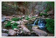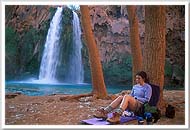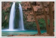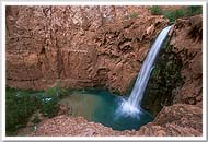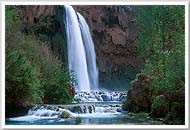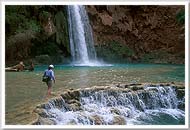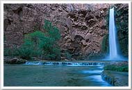 Havasu Canyon is a paradise of waterfalls and cottonwoods flanked by towering rock walls. A ten mile hike in leads to the stream-side campsites, from which views of the major falls are only a few minutes walk away.