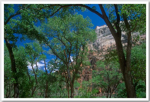 View through the canopy of trees in Zion Canyon, Zion National Park, UT