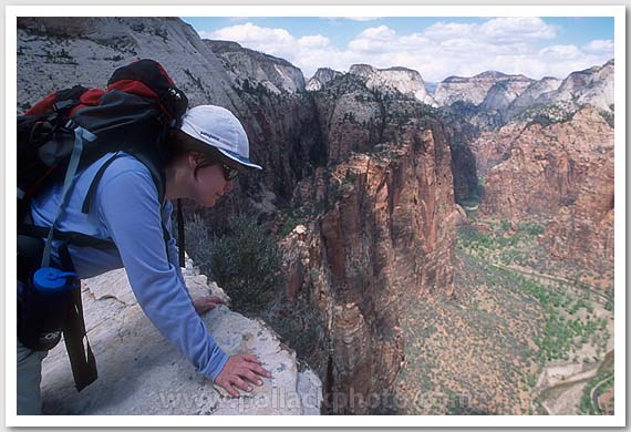Anna Alonzo peering over the edge of Angel's Landing, Zion National Park, UT